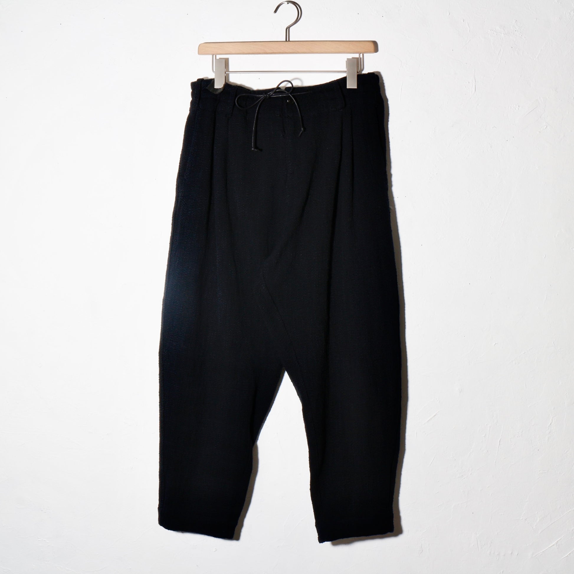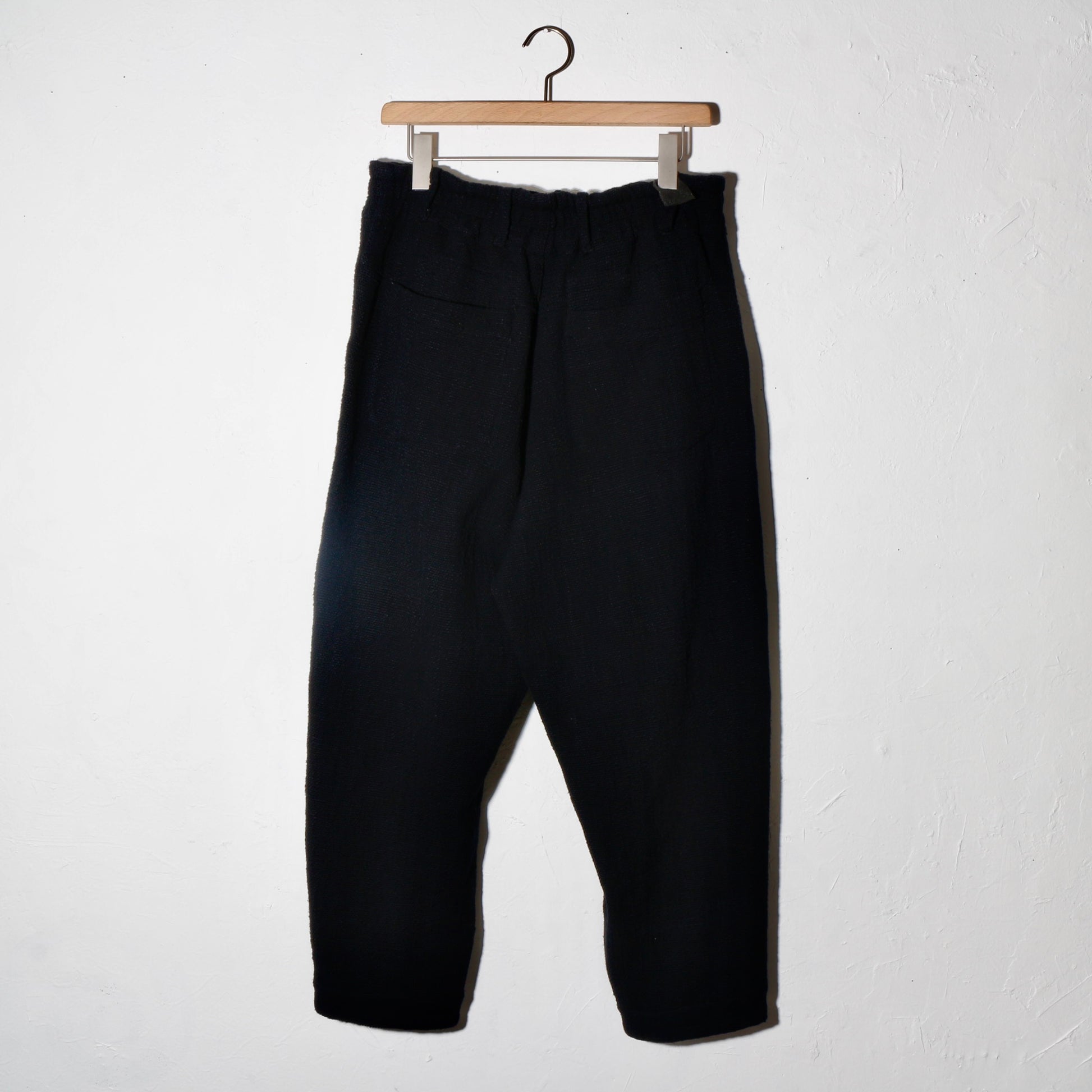 -ウエストがゴムと紐使用でワイド過ぎないゆったりとしたシルエットと履きやすさが特徴のテーパードパンツ