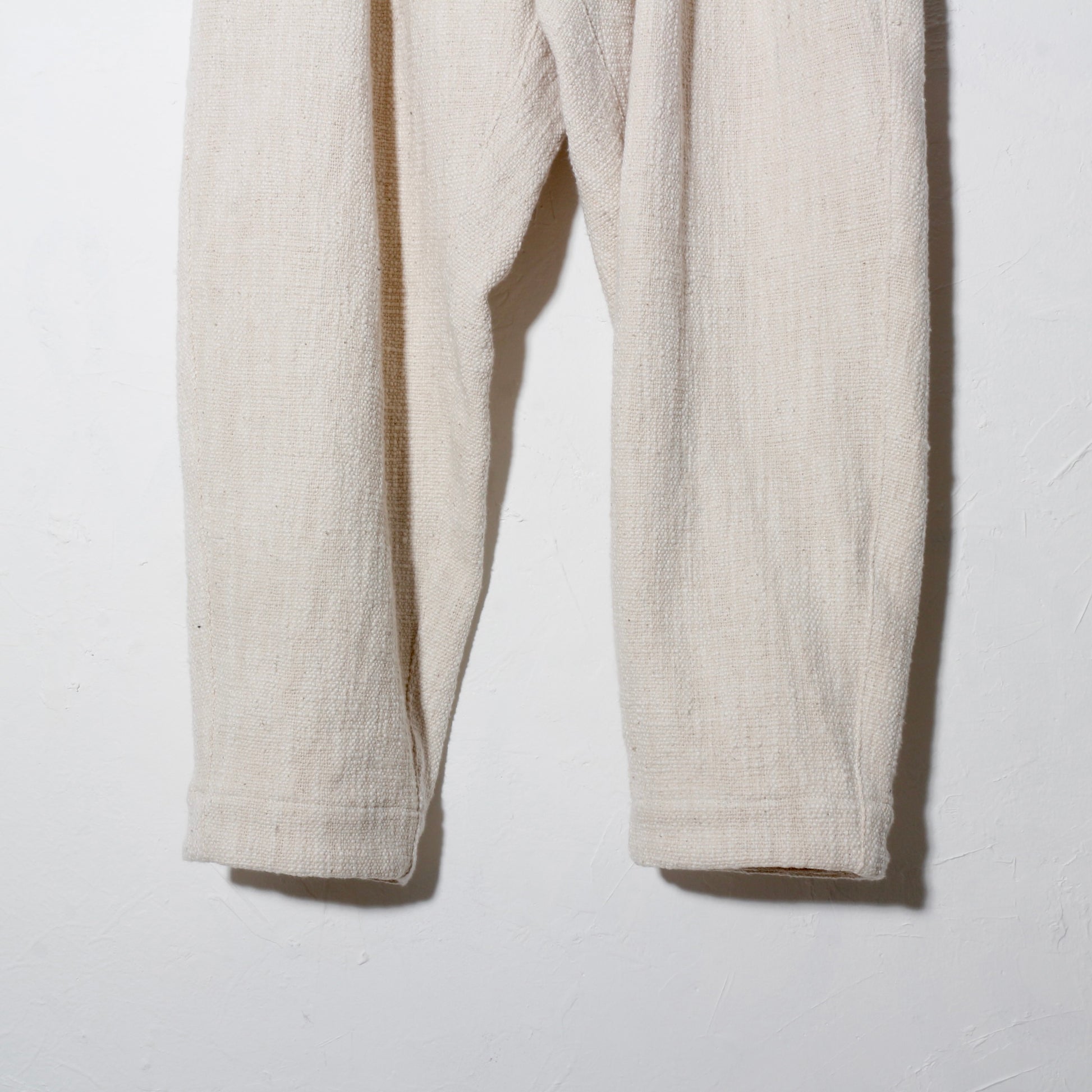 -手紡ぎができる最 も 太い番手の糸を手作業で撚ることで、太さの異なるランダムな撚糸を作り、手織りで織り上げたオールハンドメイドの特別なファブリックです。
