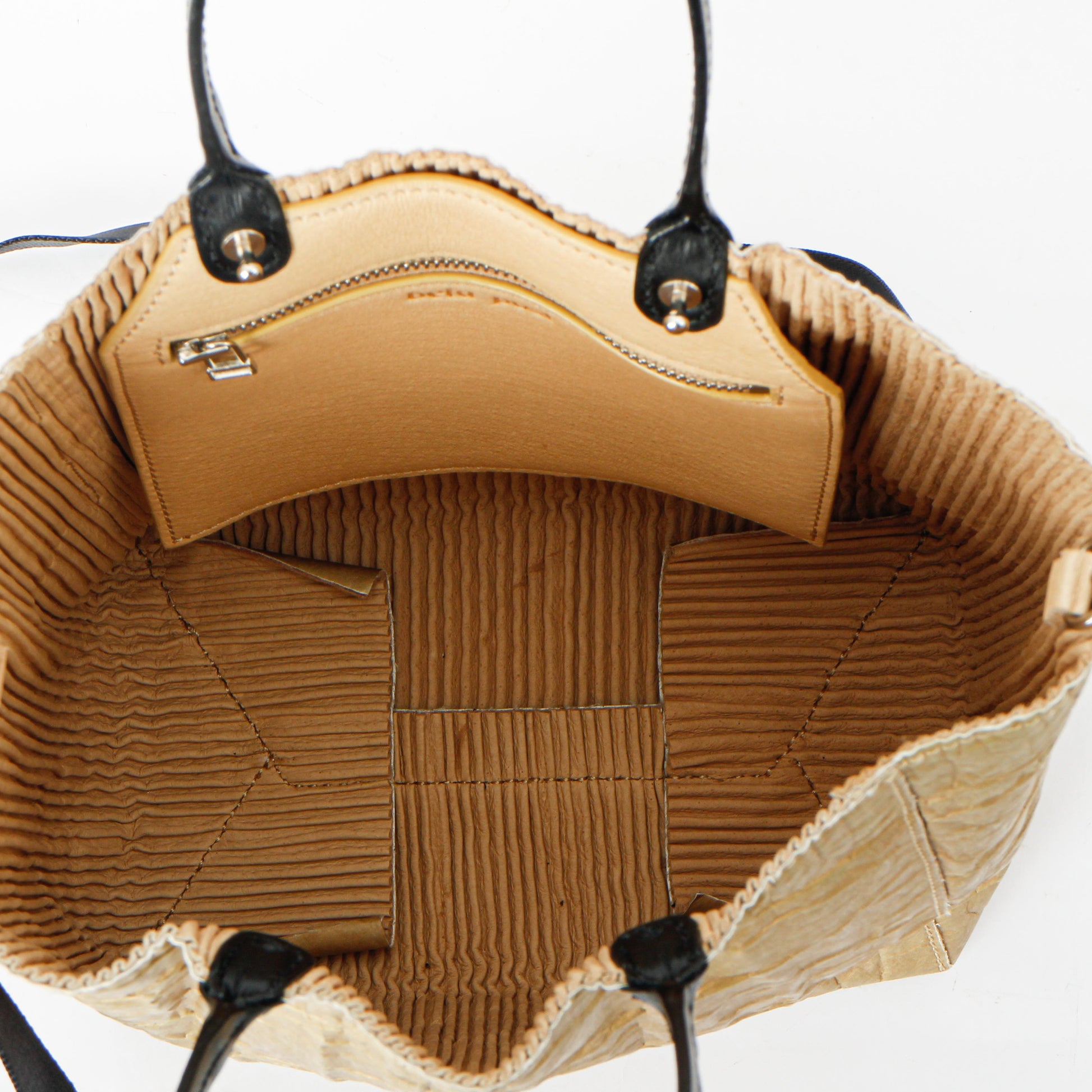 タイベックとプリーツレザーを貼り合わせた素材は"繰り返し使えるダンボール"をテーマにしています。