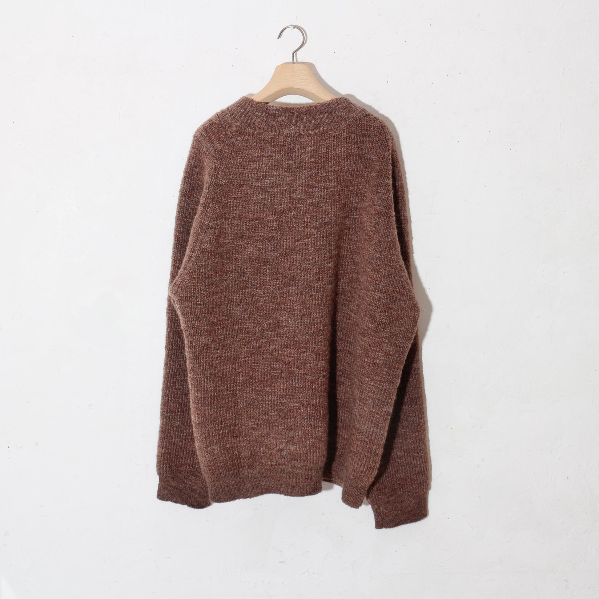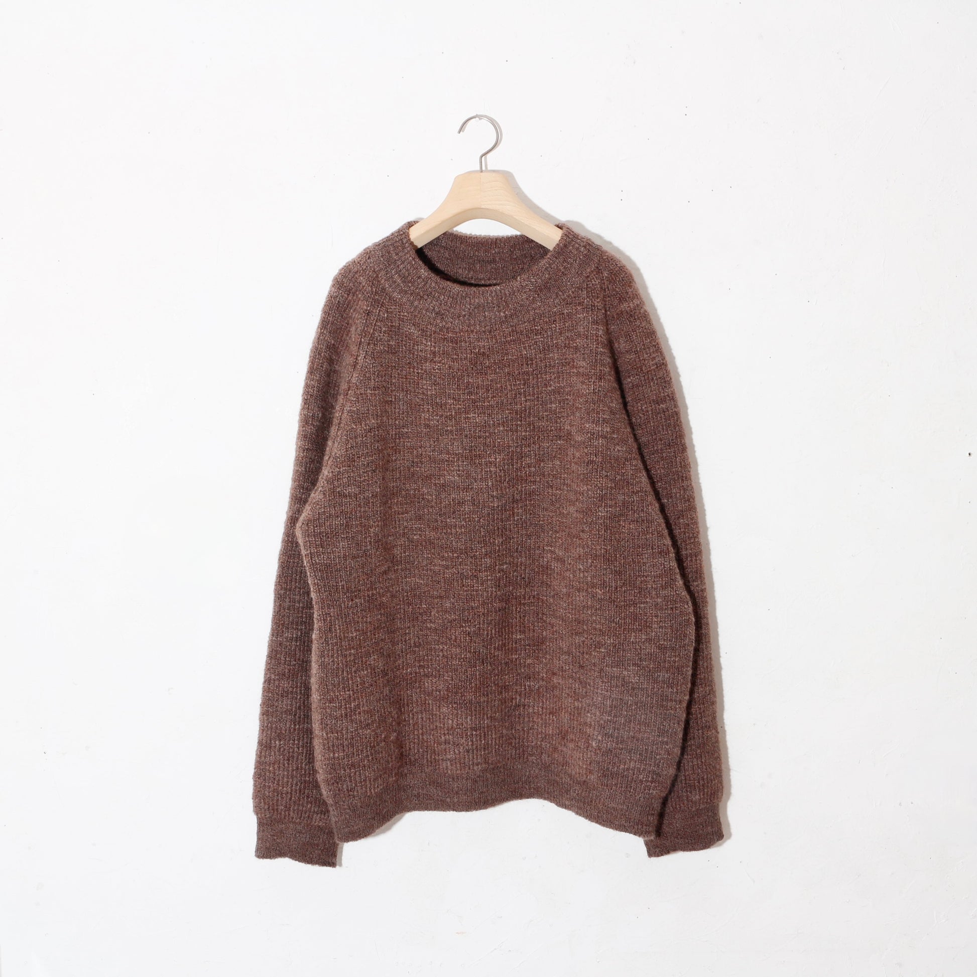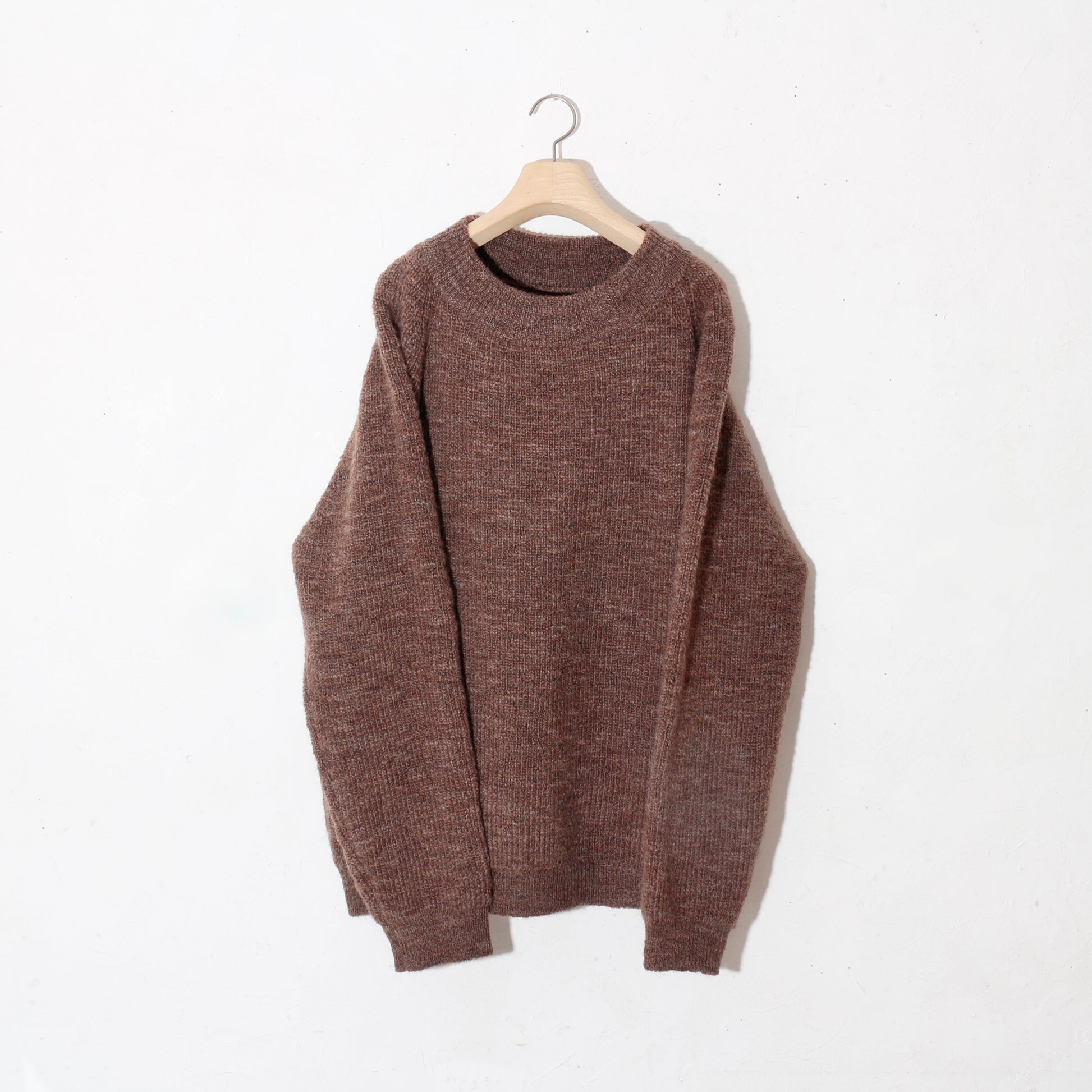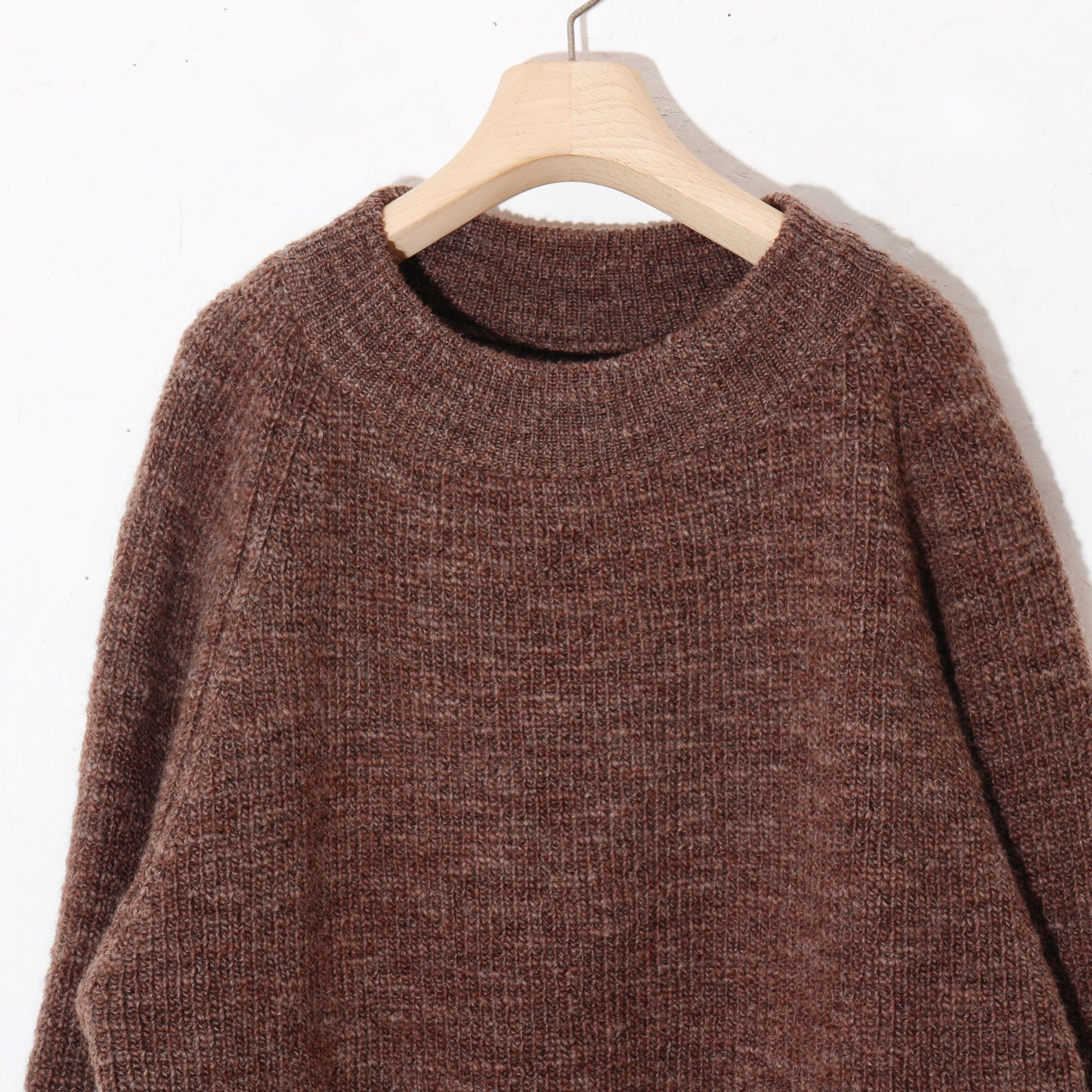 -南米ウルグアイ産のノンミュールジングウールを太番手のスラブ糸に紡ぎ、リブ部分を除いて全体を畦編みで仕上げています。