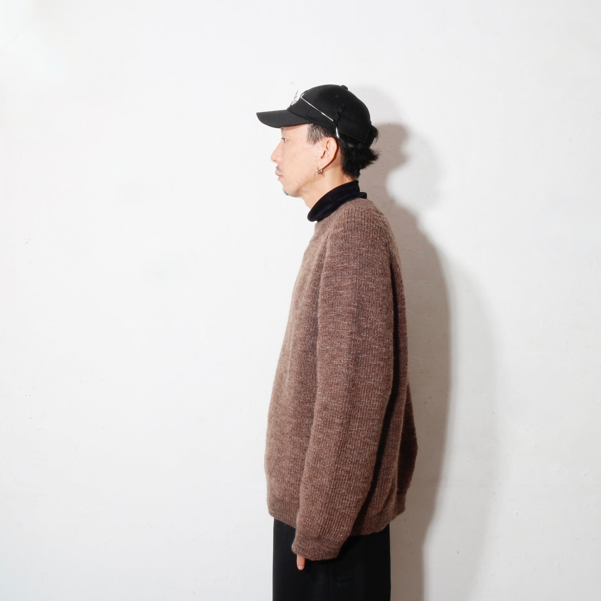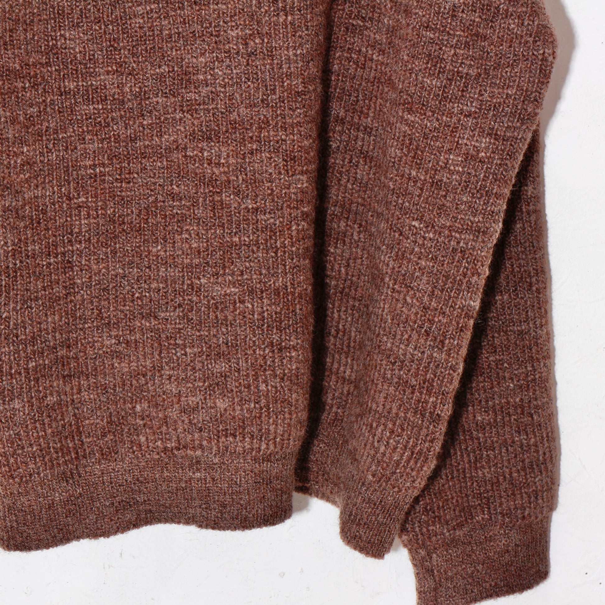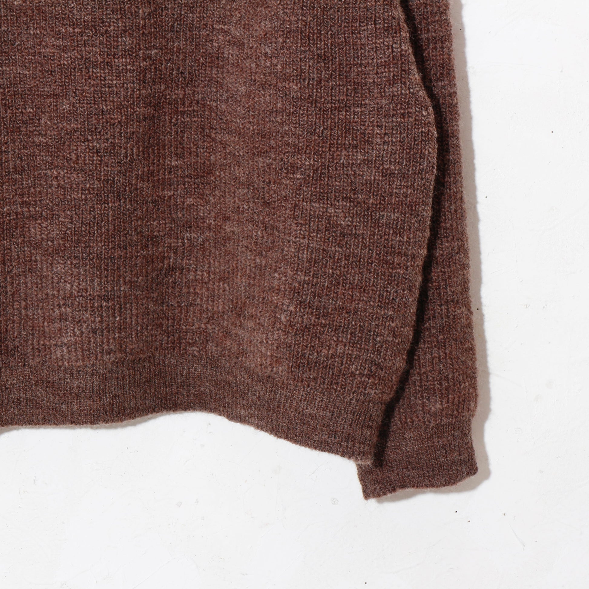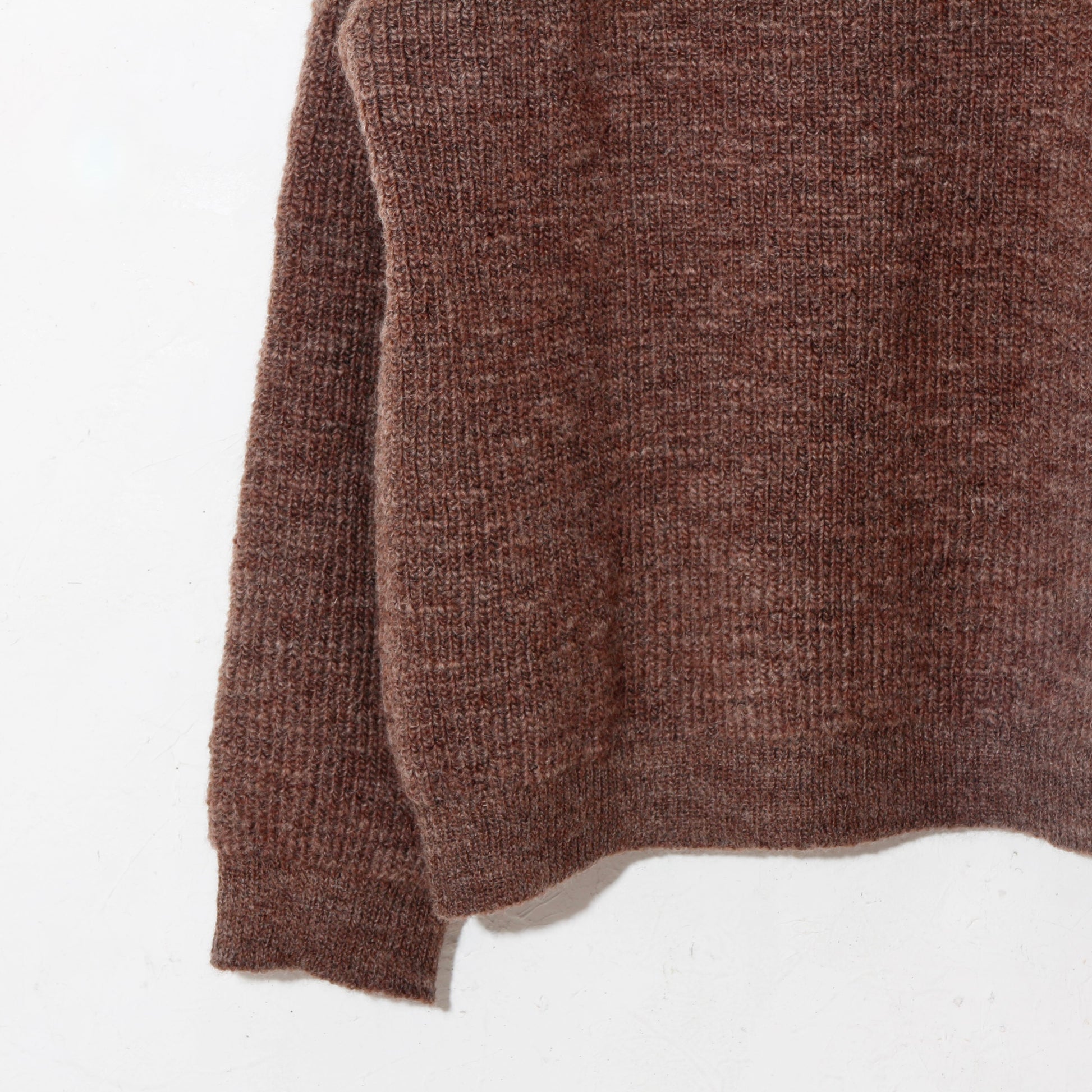 -南米ウルグアイ産のノンミュールジングウールを太番手のスラブ糸に紡ぎ、リブ部分を除いて全体を畦編みで仕上げています。