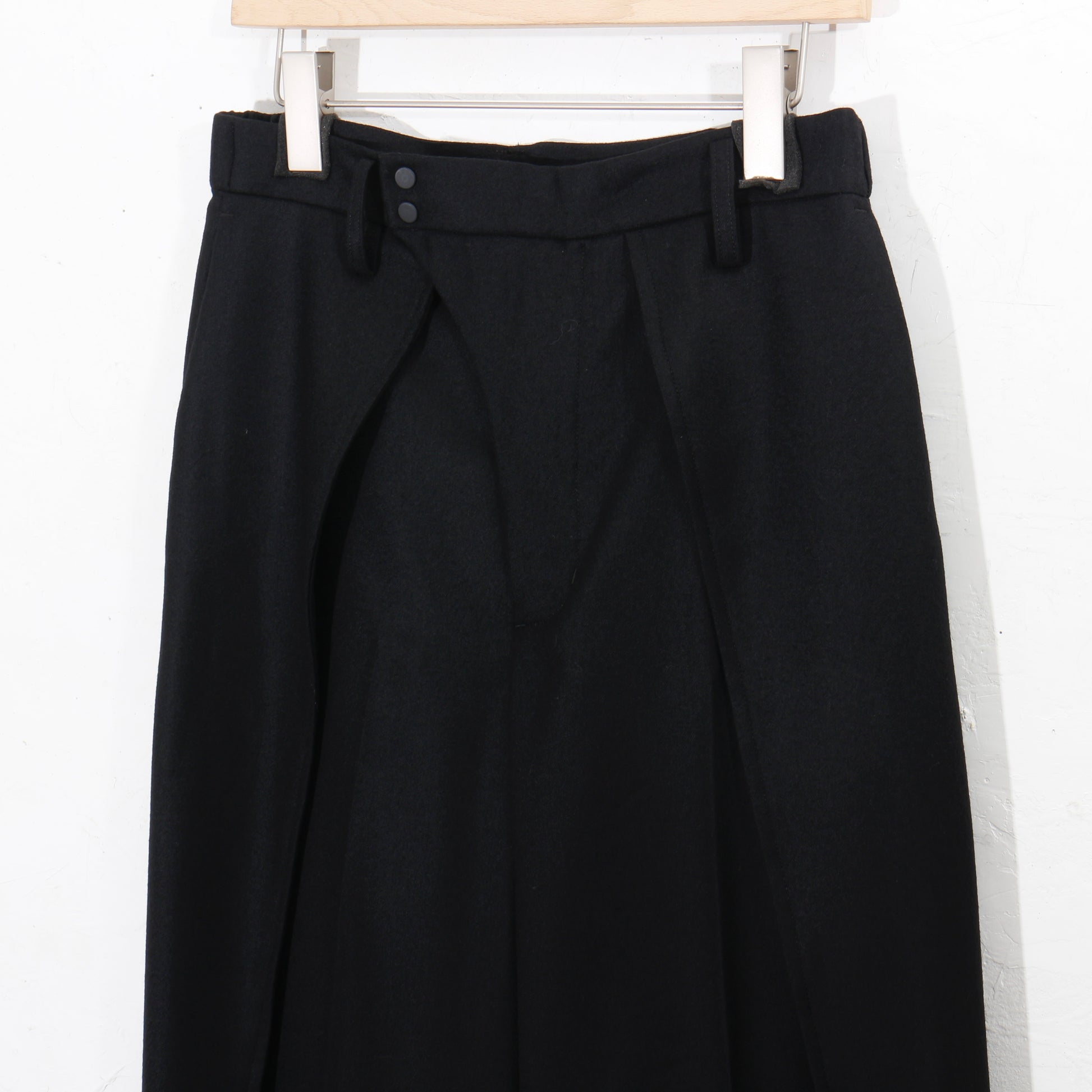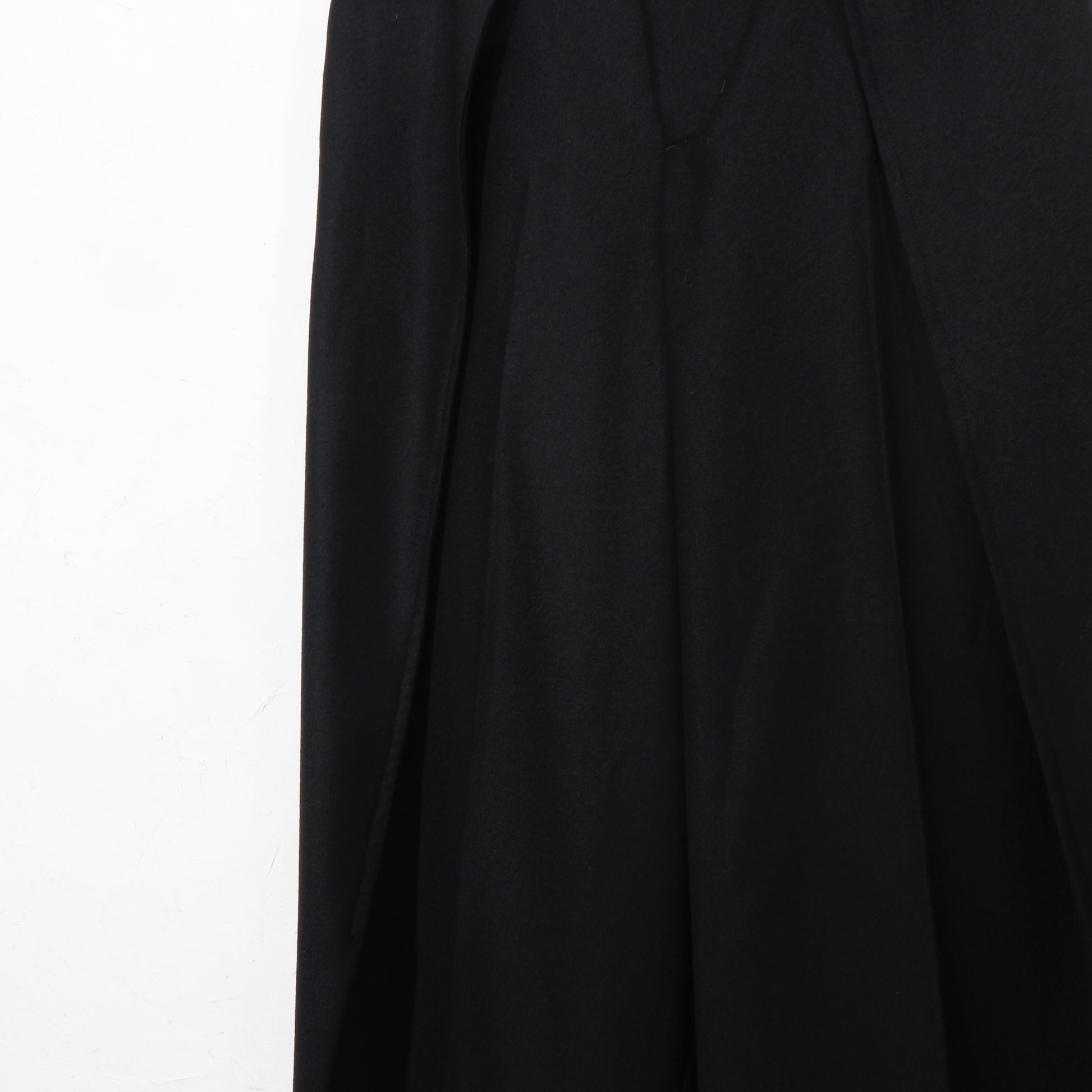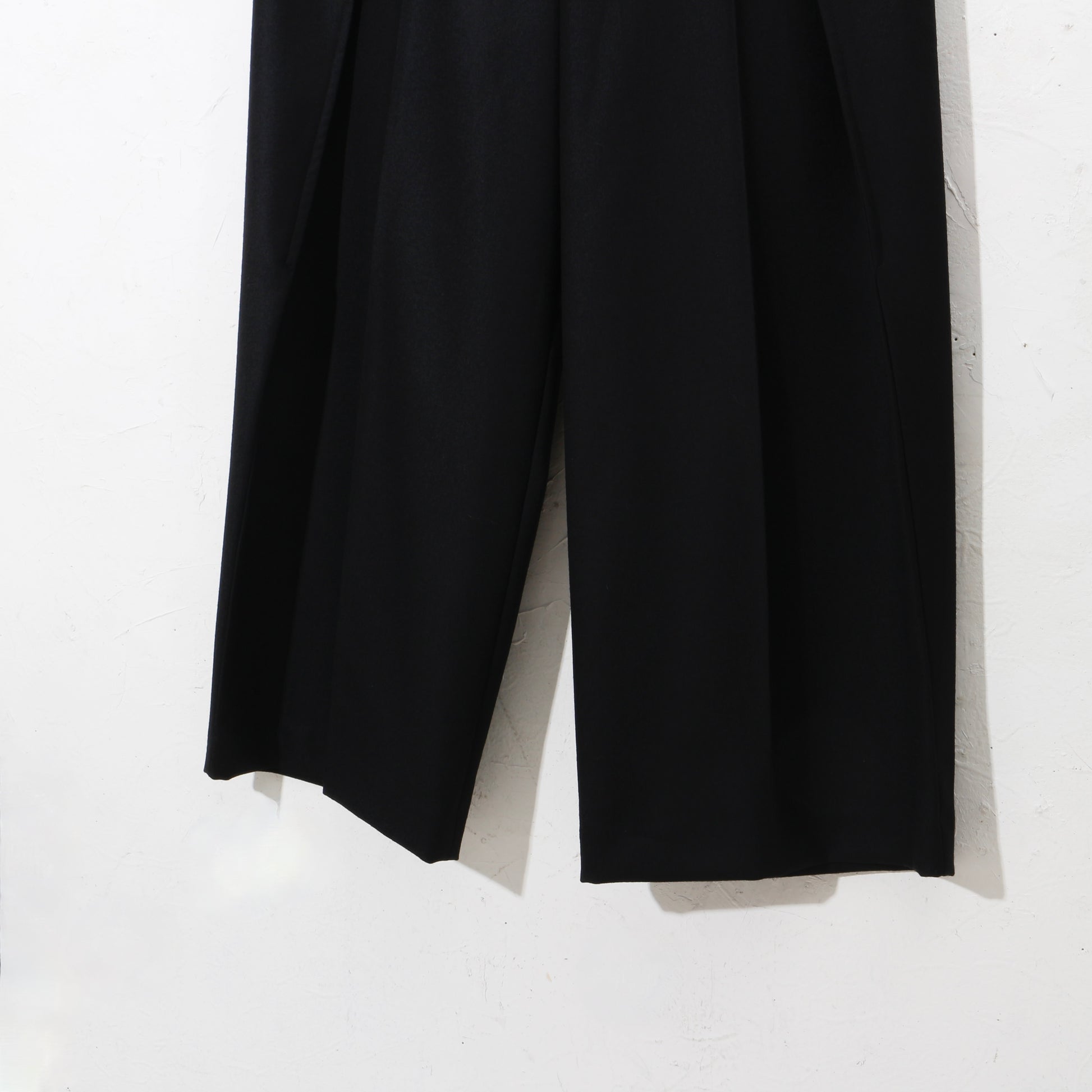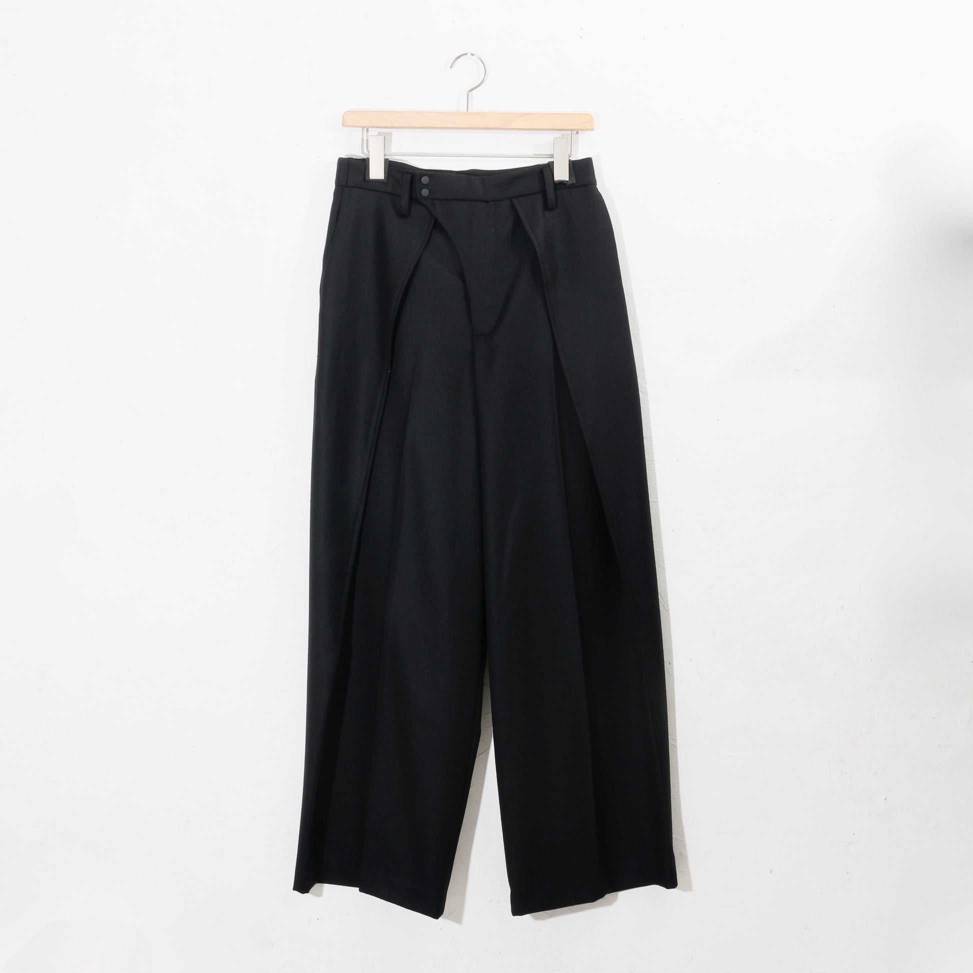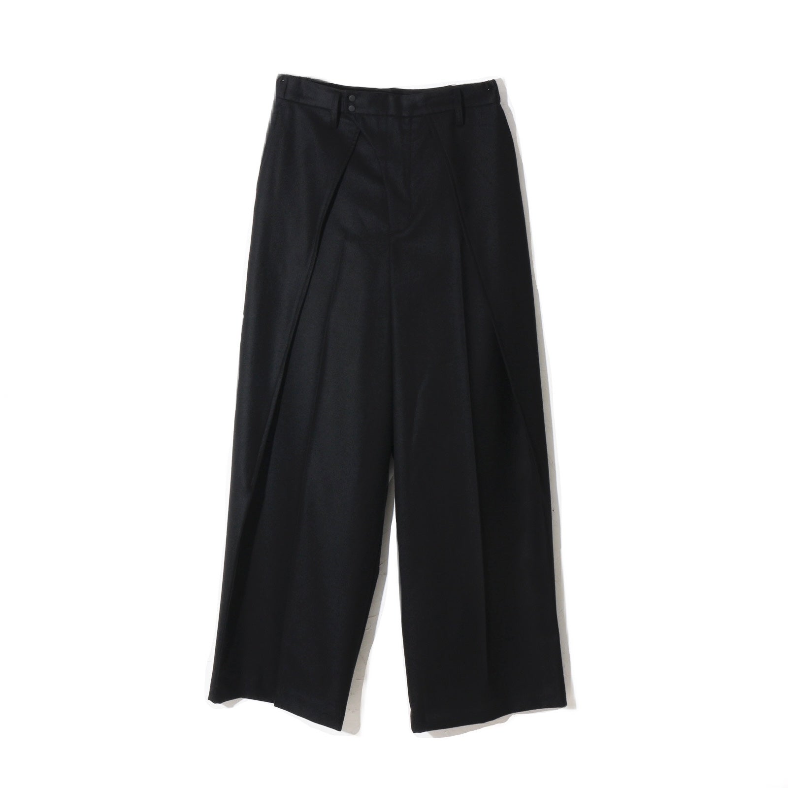 - フロントの大きなタックが脚を覆うボールドシルエット
