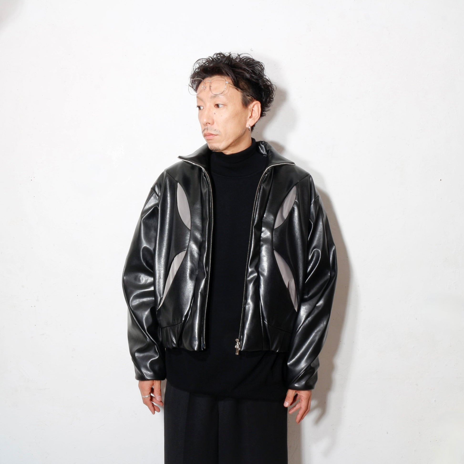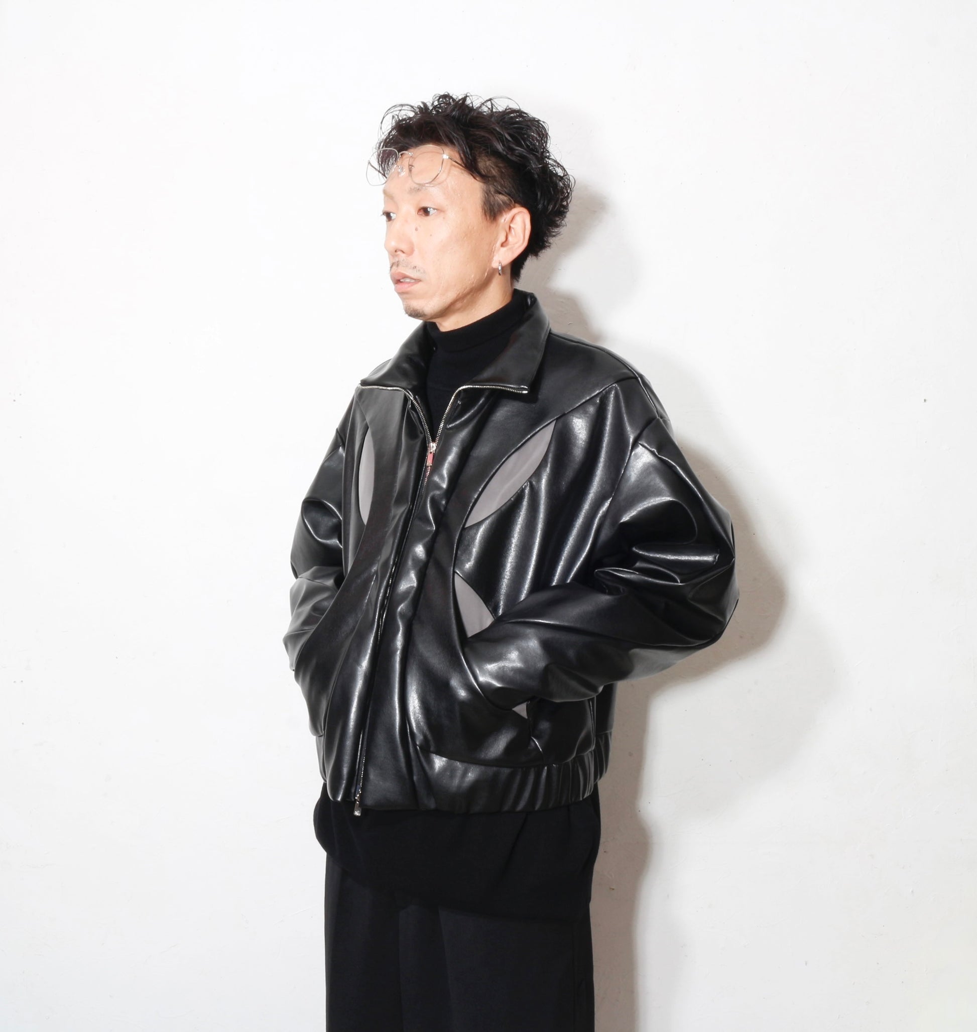 -強く丸みを描く袖のシルエット、曲線の交わりによってデザインされた4つのポケット、瑞々しい光沢を持つシンセティックレザーが特徴