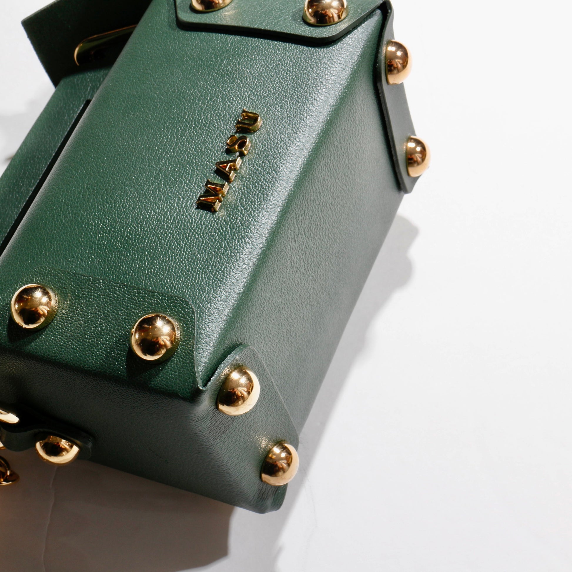 -ツヤのある牛革を使用し、縫製は一切入れず丸型の鋲の打ち込みのみで形作られ、ゴールドのチェーンが実用性と共に魅力を際立たせています