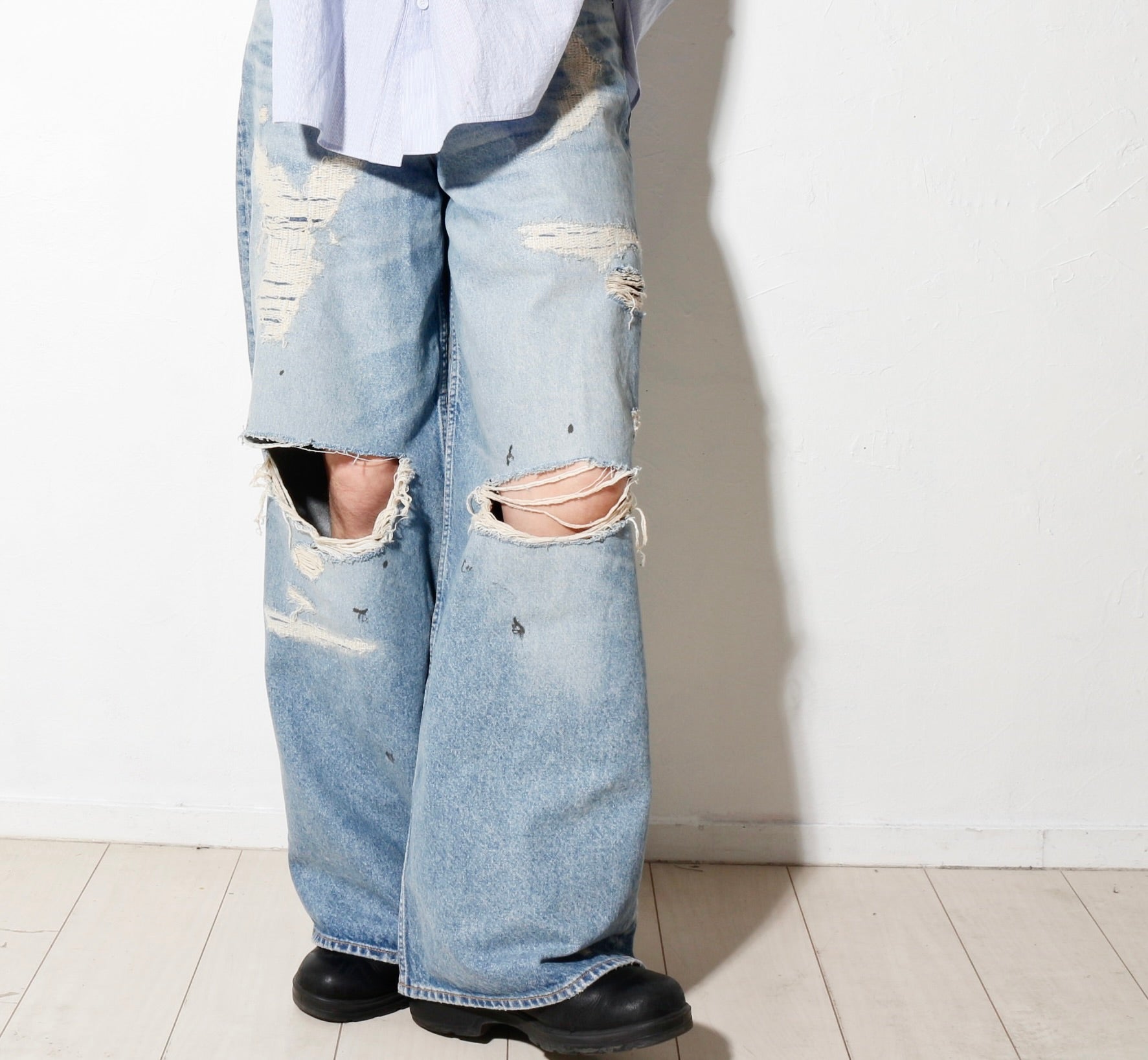 ーブランドを代表するシグネチャーのバギーシルエットに加えて右身頃には天使、左身頃には羽のシルエットを象ったダメージを美しさに変えるという遊び心のあるアイロニーを表現