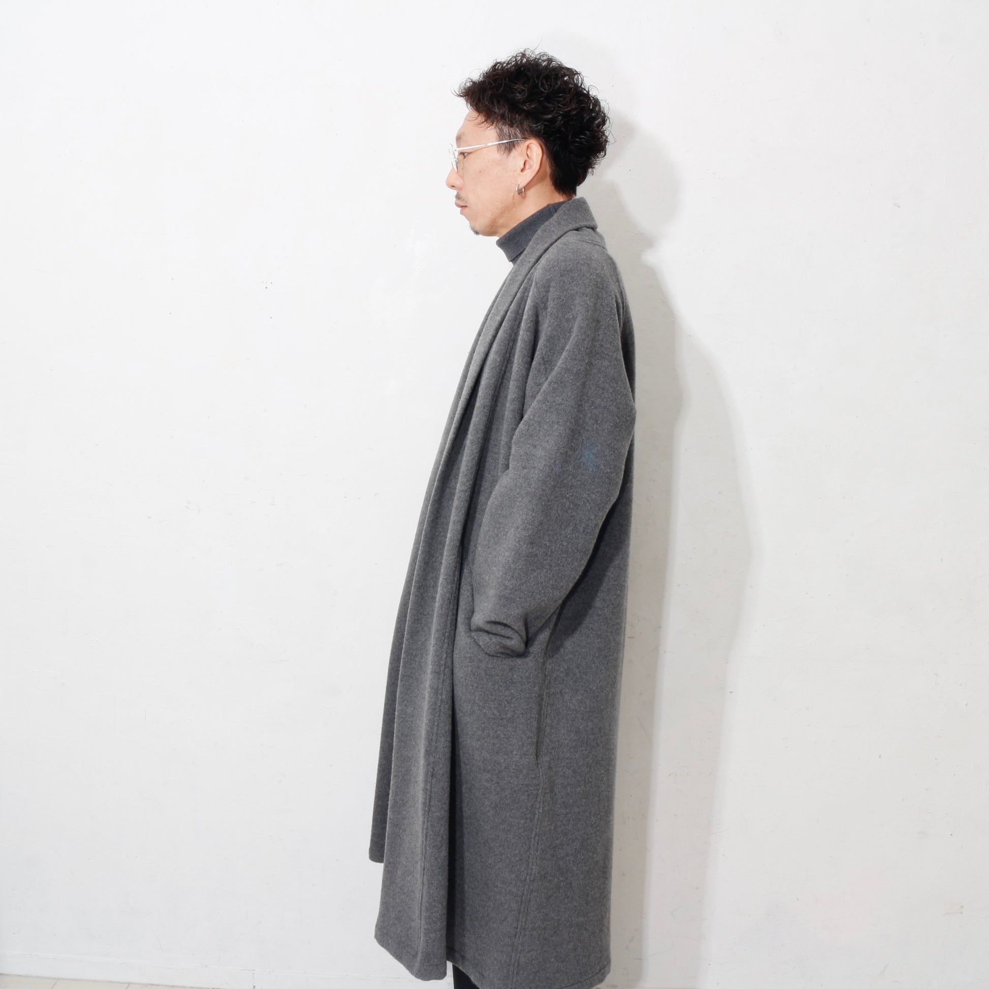 日本の綿入れの半纏から発想しています。洋服のコートのように裾は広がっておらず、衿を立てて前を合わせると着物のような合わせになるロングコートです。