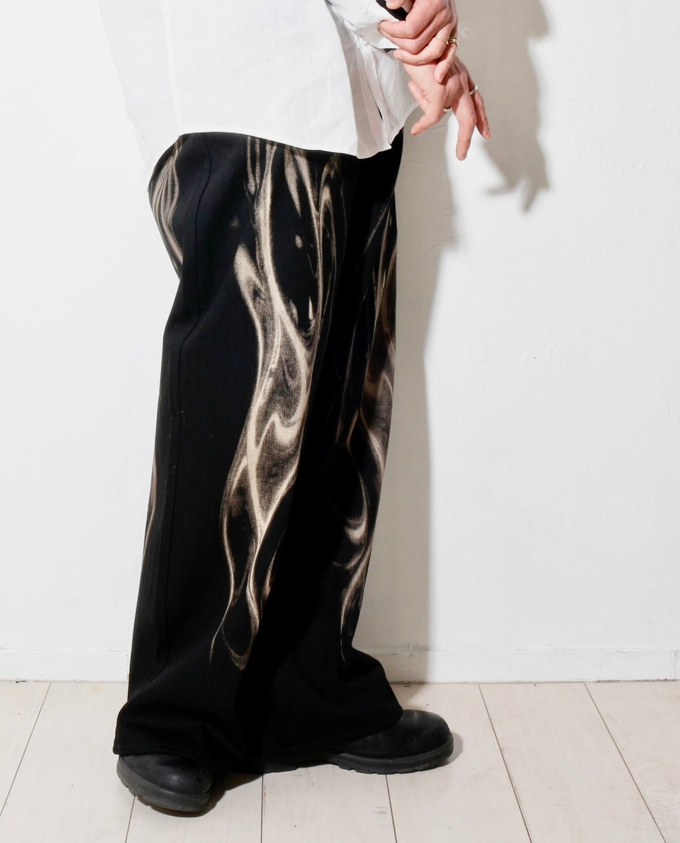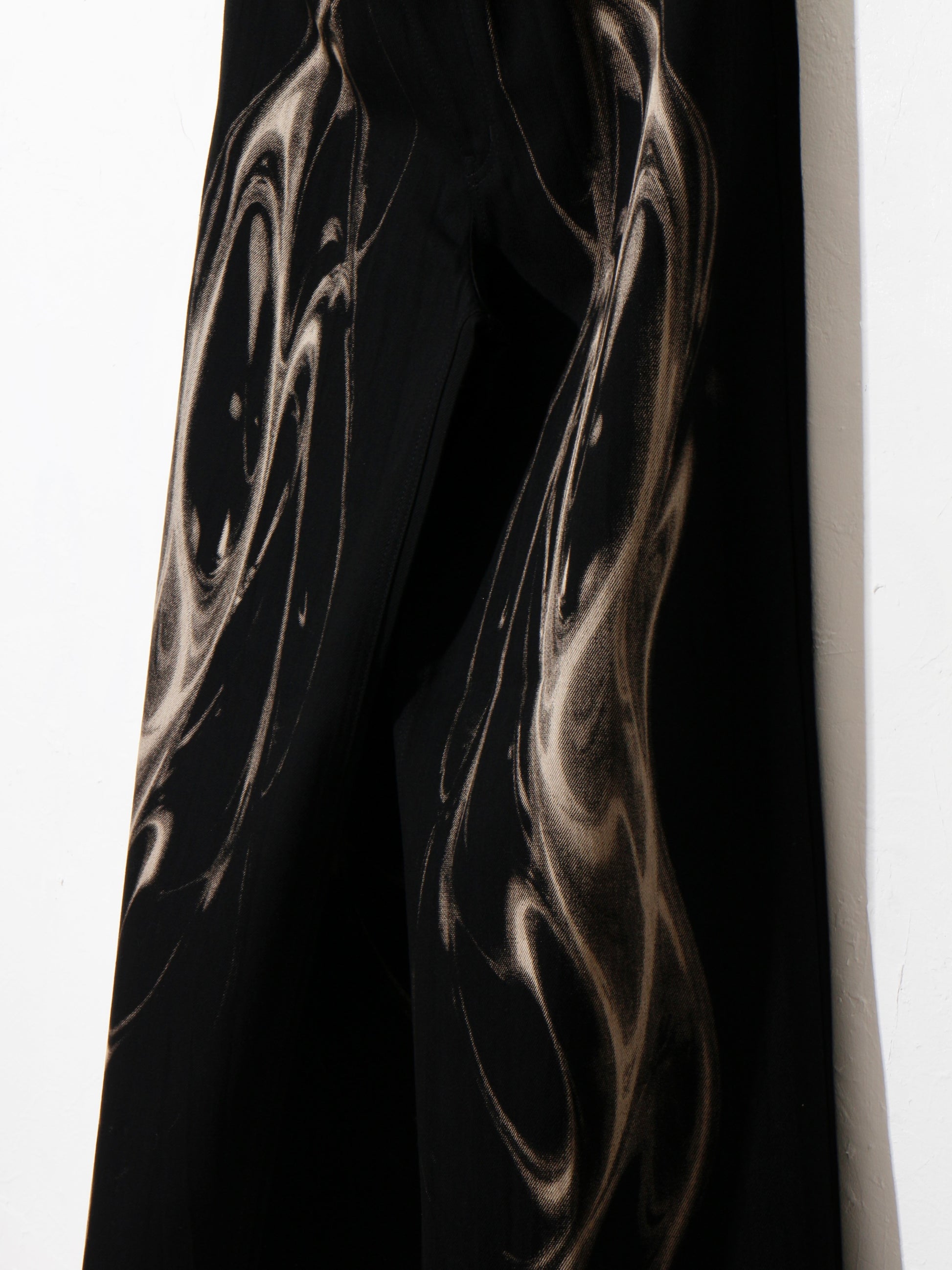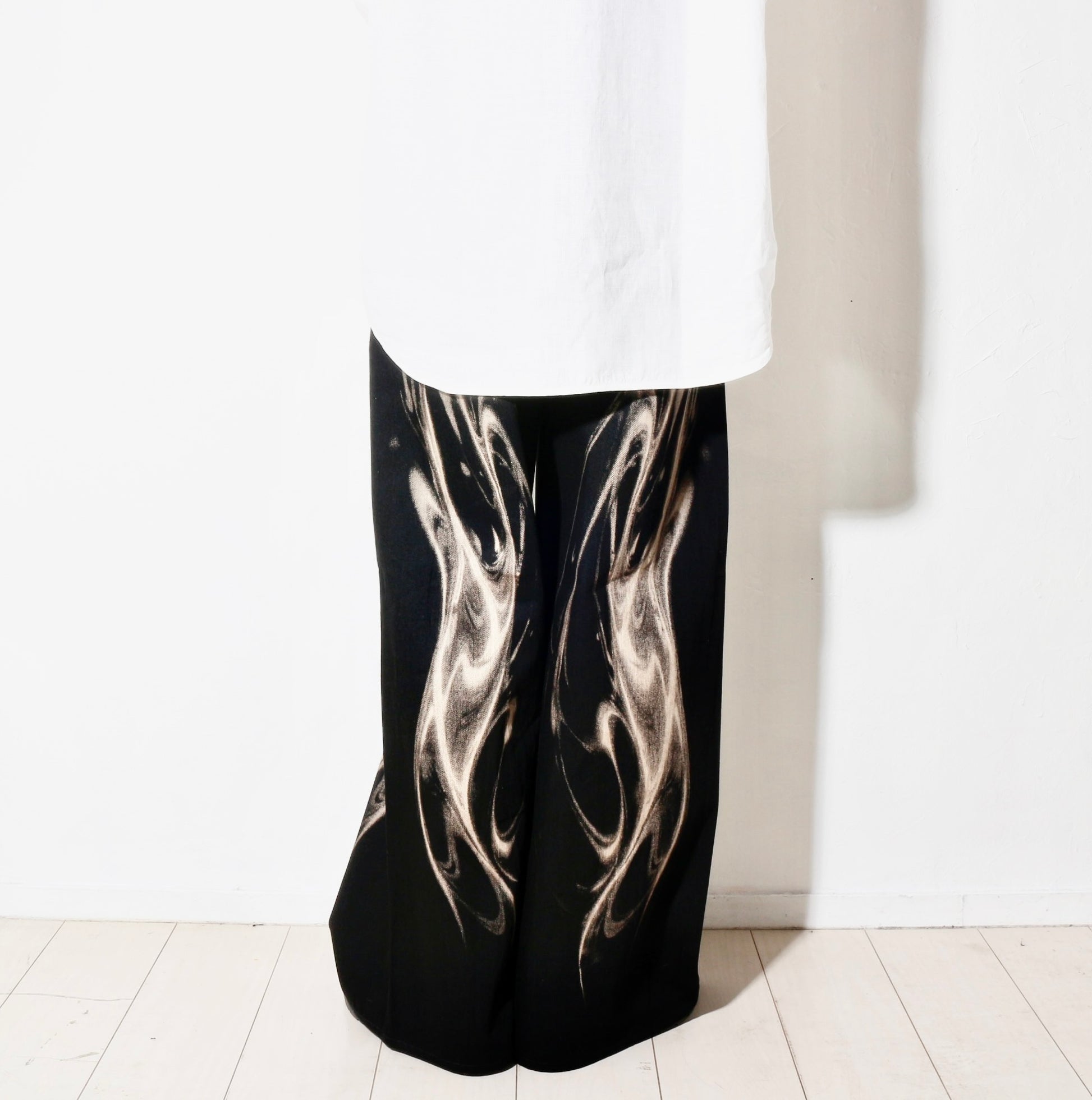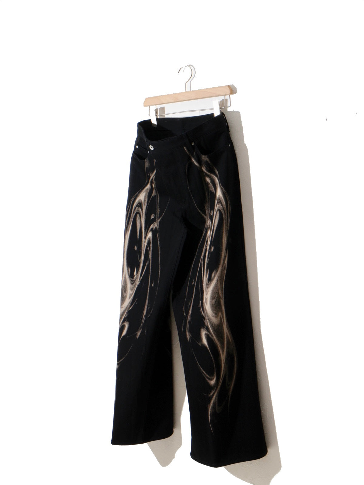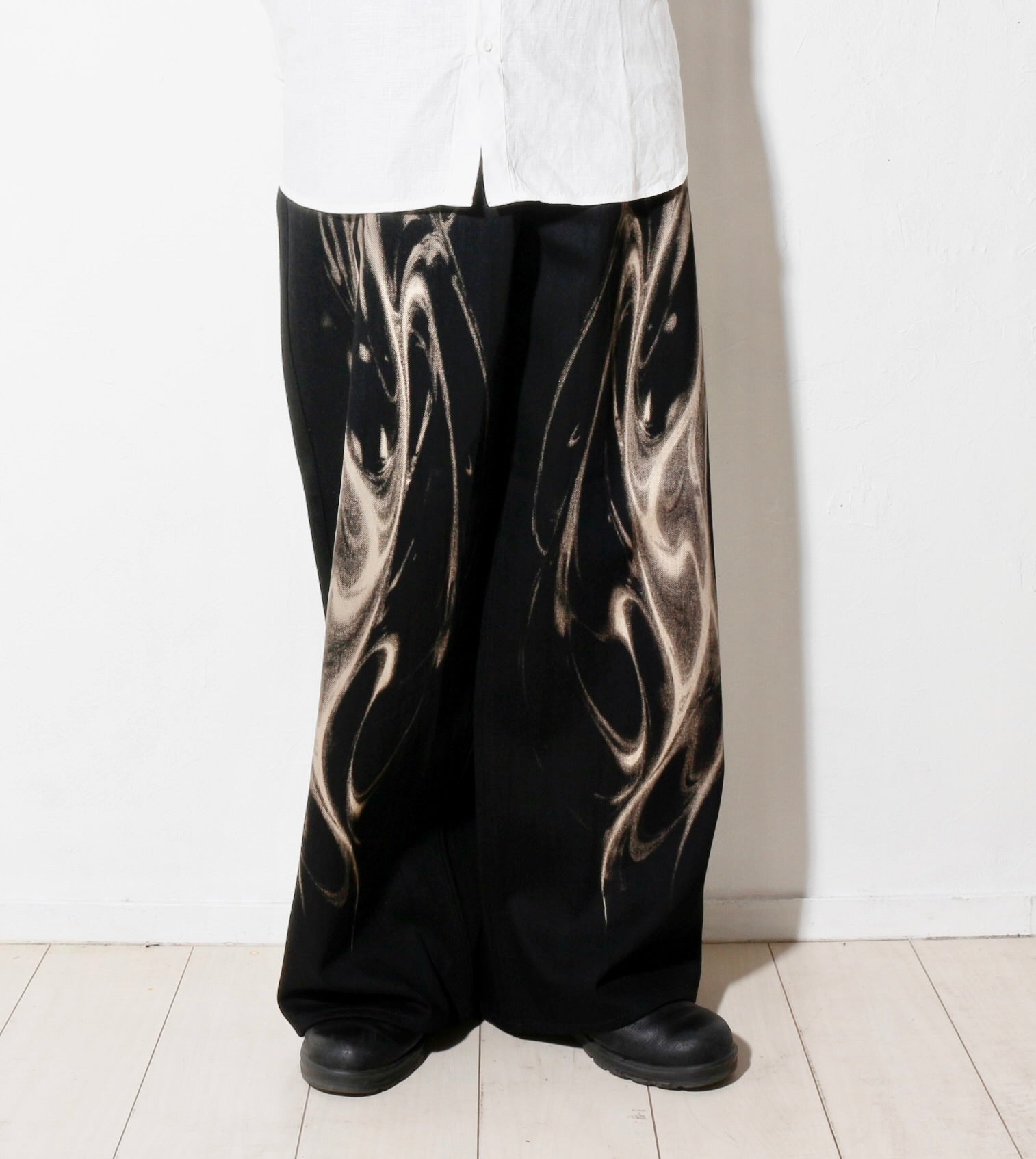 - 光の屈折やうねりを抜染(ブリーチ)によって表現したワイドデニム